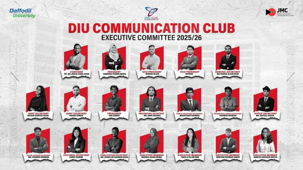 ড্যাফোডিল ইন্টারন্যাশনাল ইউনিভার্সিটির সাংবাদিকতা, মিডিয়া ও যোগাযোগ বিভাগের নিজস্ব সংগঠন ‘ডিআইইউ কমিউনিকেশন ক্লাব’-এর নতুন কমিটি ঘোষণা করা হয়েছে।